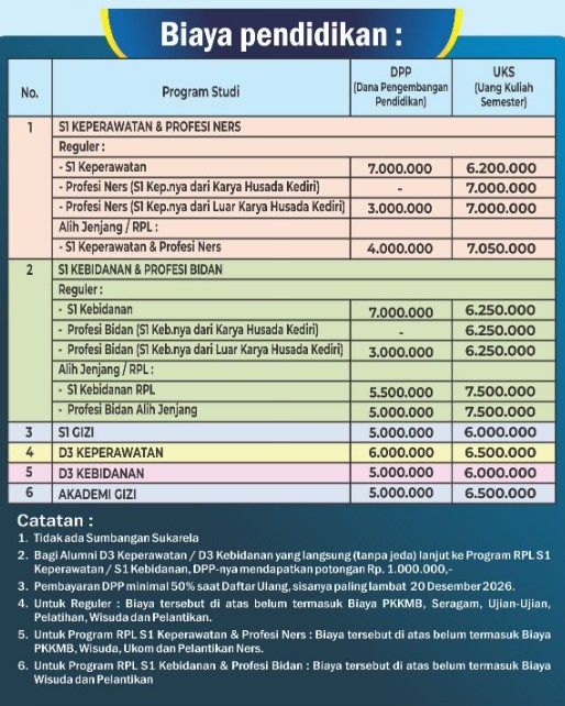 Untuk biaya pendaftaran dibayarkan atau ditransfer melalui Bank Mandiri a.n. Yayasan Karya Husada Kediri No. Rekening...